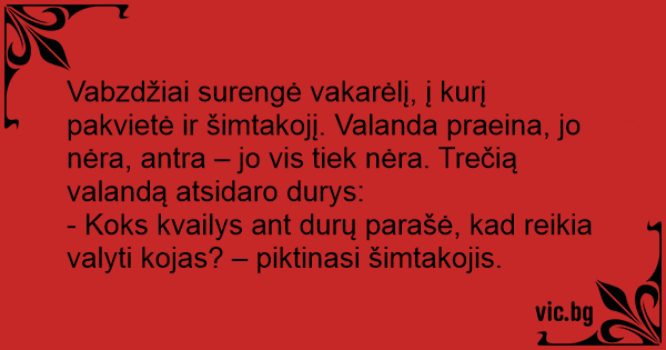 Vabzdžiai surengė vakarėlį, į kurį pakvietė ir šimtakojį. Valanda praeina, jo nėra, antra – jo vis tiek nėra. Trečią valandą atsidaro durys: