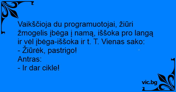 Vaikščioja du programuotojai, žiūri žmogelis įbėga į namą, iššoka pro langą ir vėl įbėga-iššoka ir t. T. Vienas sako: