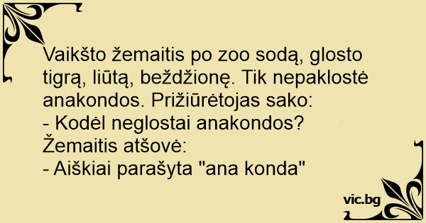 Vaikšto žemaitis po zoo sodą, glosto tigrą, liūtą, beždžionę. Tik nepaklostė anakondos. Prižiūrėtojas sako: