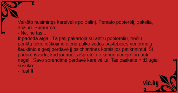 Ir padeda atgal. Tą patį pakartoja su antru popierėliu, trečiu... penktą tokio ieškojimo dieną pulko vadas pastebėjęs nenormalų šauktinio elgesį perdavė jį psichiatrinės komisijos patikrinimui. Ši padarė išvadą, kad jaunuolis išprotėjo ir kariuomenėje tarnauti negali. Savo sprendimą perdavė kareivėliui. Tas paskaite ir džiugiai sušuko: