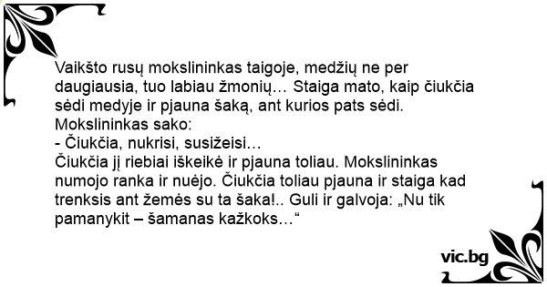 Vaikšto rusų mokslininkas taigoje, medžių ne per daugiausia, tuo labiau žmonių… Staiga mato, kaip čiukčia sėdi medyje ir pjauna šaką, ant kurios pats sėdi. Mokslininkas sako: