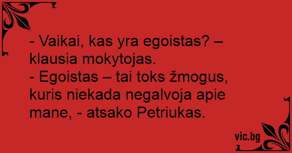 - Egoistas – tai toks žmogus, kuris niekada negalvoja apie mane, - atsako Petriukas.