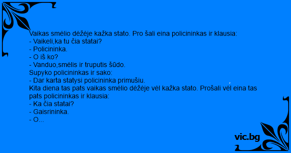 Kita diena tas pats vaikas smėlio dėžėje vėl kažka stato. Prošali vėl eina tas pats policininkas ir klausia: