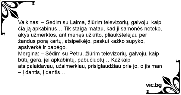 Mergina: – Sėdim su Petru, žiūrim televizorių, galvoju, kaip būtų gera, jei apkabintų, pabučiuotų… Kažkaip atsipalaidavau, užsimerkiau, prisiglaudžiau prie jo, o jis man – į dantis, į dantis…