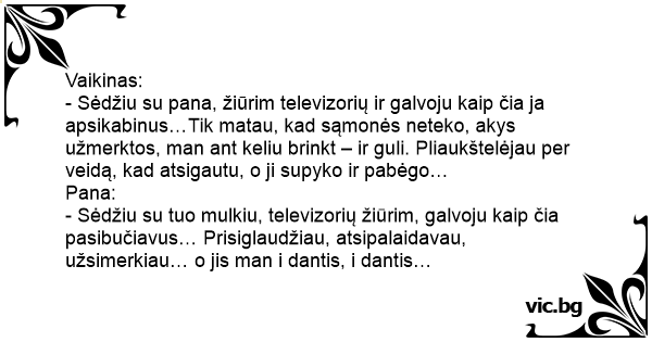 - Sėdžiu su pana, žiūrim televizorių ir galvoju kaip čia ja apsikabinus…Tik matau, kad sąmonės neteko, akys užmerktos, man ant keliu brinkt – ir guli. Pliaukštelėjau per veidą, kad atsigautu, o ji supyko ir pabėgo…
