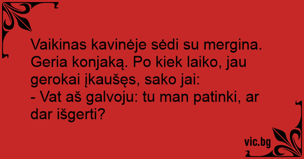 Vaikinas kavinėje sėdi su mergina. Geria konjaką. Po kiek laiko, jau gerokai įkaušęs, sako jai: