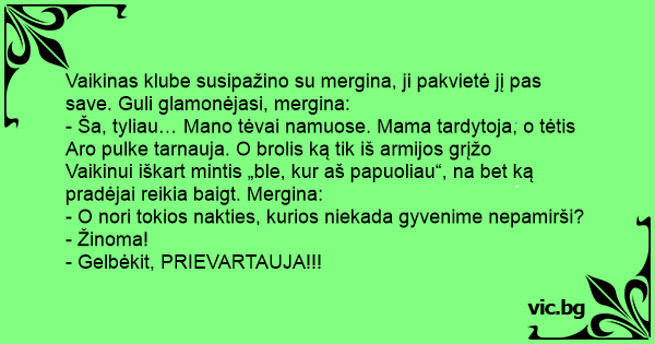 Vaikinas klube susipažino su mergina, ji pakvietė jį pas save. Guli glamonėjasi, mergina: