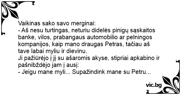 - Aš nesu turtingas, neturiu didelės pinigų sąskaitos banke, vilos, prabangaus automobilio ar pelningos kompanijos, kaip mano draugas Petras, tačiau aš tave labai myliu ir dievinu.