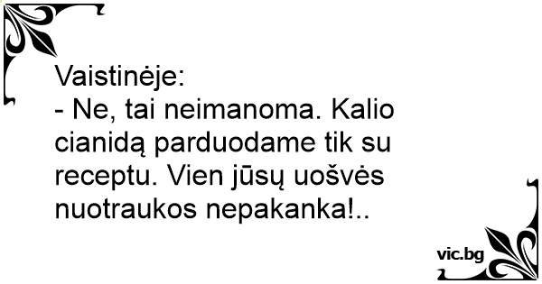 - Ne, tai neimanoma. Kalio cianidą parduodame tik su receptu. Vien jūsų uošvės nuotraukos nepakanka!..