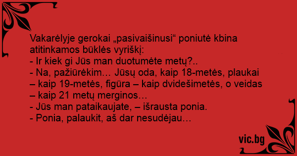 - Na, pažiūrėkim… Jūsų oda, kaip 18-metės, plaukai – kaip 19-metės, figūra – kaip dvidešimetės, o veidas – kaip 21 metų merginos…