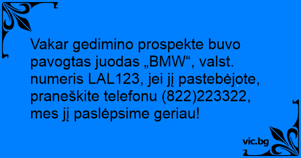 Vakar gedimino prospekte buvo pavogtas juodas „BMW“, valst. numeris LAL123, jei jį pastebėjote, praneškite telefonu (822)223322, mes jį paslėpsime geriau!