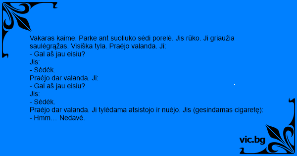 Vakaras kaime. Parke ant suoliuko sėdi porelė. Jis rūko. Ji griaužia saulėgrąžas. Visiška tyla. Praėjo valanda. Ji: