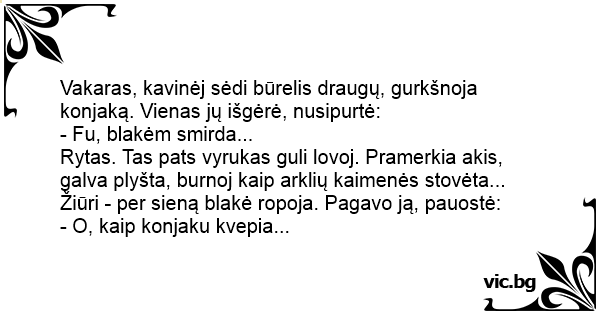 Rytas. Tas pats vyrukas guli lovoj. Pramerkia akis, galva plyšta, burnoj kaip arklių kaimenės stovėta... Žiūri - per sieną blakė ropoja. Pagavo ją, pauostė: