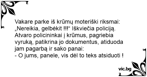 Vakare parke iš krūmų moteriški riksmai: „Nereikia, gelbėkit !!!“ Iškviečia policiją. Atvaro policininkai į krūmus, pagriebia vyruką, patikrina jo dokumentus, atiduoda jam pagarbą ir sako panai: