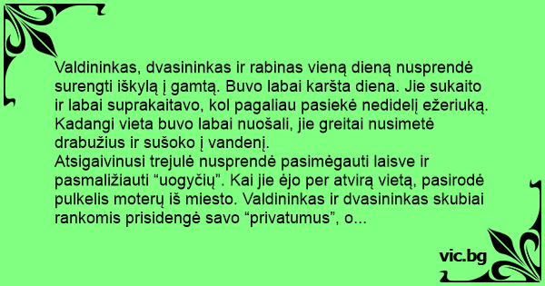 Atsigaivinusi trejulė nusprendė pasimėgauti laisve ir pasmaližiauti “uogyčių”. Kai jie ėjo per atvirą vietą, pasirodė pulkelis moterų iš miesto. Valdininkas ir dvasininkas skubiai rankomis prisidengė savo “privatumus”, o rabinas – veidą.