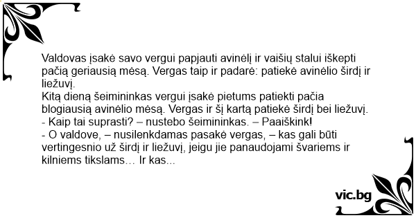 Valdovas įsakė savo vergui papjauti avinėlį ir vaišių stalui iškepti pačią geriausią mėsą. Vergas taip ir padarė: patiekė avinėlio širdį ir liežuvį.