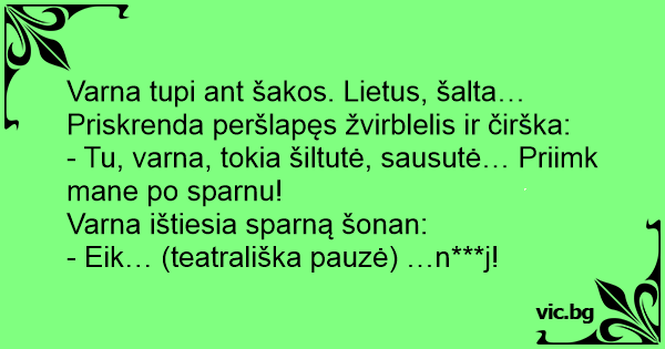 Varna tupi ant šakos. Lietus, šalta… Priskrenda peršlapęs žvirblelis ir čirška: