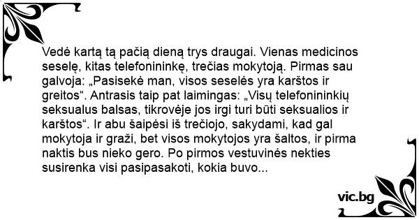 Vedė kartą tą pačią dieną trys draugai. Vienas medicinos seselę, kitas telefonininkę, trečias mokytoją. Pirmas sau galvoja: „Pasisekė man, visos seselės yra karštos ir greitos“. Antrasis taip pat laimingas: „Visų telefonininkių seksualus balsas, tikrovėje jos irgi turi būti seksualios ir karštos“. Ir abu šaipėsi iš trečiojo, sakydami, kad gal mokytoja ir graži, bet visos mokytojos yra šaltos, ir pirma naktis bus nieko gero. Po pirmos vestuvinės nekties susirenka visi pasipasakoti, kokia buvo ta naktis. Pirmi du nukabinę nosis, o trečiasis pavargęs, bet laimingas. Pirmasis atsidūsta: