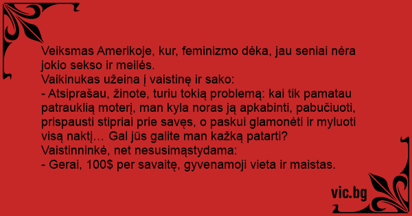 - Atsiprašau, žinote, turiu tokią problemą: kai tik pamatau patrauklią moterį, man kyla noras ją apkabinti, pabučiuoti, prispausti stipriai prie savęs, o paskui glamonėti ir myluoti visą naktį… Gal jūs galite man kažką patarti?