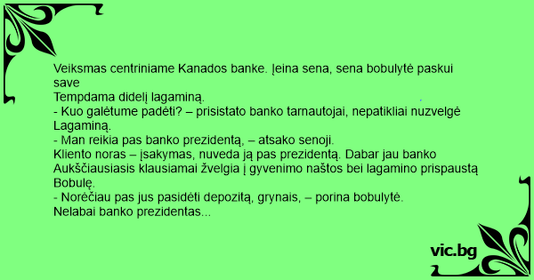- Man reikia pas banko prezidentą, – atsako senoji.