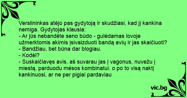 Verslininkas atėjo pas gydytoją ir skudžiasi, kad jį kankina nemiga. Gydytojas klausia: