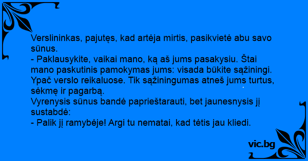 - Paklausykite, vaikai mano, ką aš jums pasakysiu. Štai mano paskutinis pamokymas jums: visada būkite sąžiningi. Ypač verslo reikaluose. Tik sąžiningumas atneš jums turtus, sėkmę ir pagarbą.