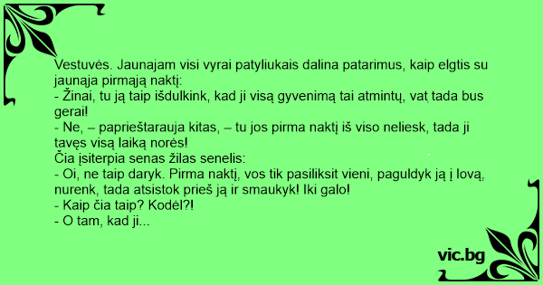 - Ne, – paprieštarauja kitas, – tu jos pirma naktį iš viso neliesk, tada ji tavęs visą laiką norės!