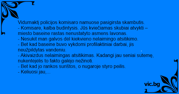 - Komisare, kalba budintysis. Jūs kviečiamas skubiai atvykti – miesto baseine rastas nenustatyto asmens lavonas.