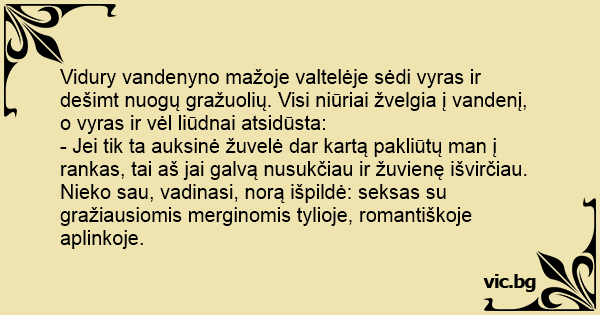 - Jei tik ta auksinė žuvelė dar kartą pakliūtų man į rankas, tai aš jai galvą nusukčiau ir žuvienę išvirčiau. Nieko sau, vadinasi, norą išpildė: seksas su gražiausiomis merginomis tylioje, romantiškoje aplinkoje.