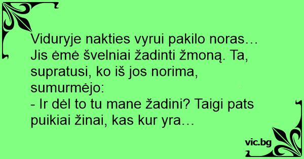 Viduryje nakties vyrui pakilo noras… Jis ėmė švelniai žadinti žmoną. Ta, supratusi, ko iš jos norima, sumurmėjo: