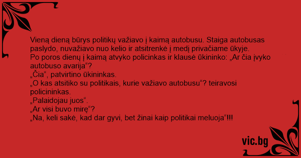 Vieną dieną būrys politikų važiavo į kaimą autobusu. Staiga autobusas paslydo, nuvažiavo nuo kelio ir atsitrenkė į medį privačiame ūkyje.