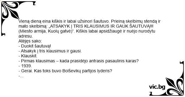- Kiški, pasakyk man atsakymus, aš irgi šautuvo noriu.