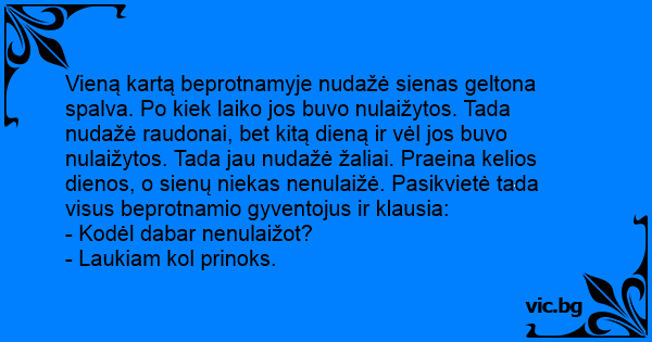 Vieną kartą beprotnamyje nudažė sienas geltona spalva. Po kiek laiko jos buvo nulaižytos. Tada nudažė raudonai, bet kitą dieną ir vėl jos buvo nulaižytos. Tada jau nudažė žaliai. Praeina kelios dienos, o sienų niekas nenulaižė. Pasikvietė tada visus beprotnamio gyventojus ir klausia: