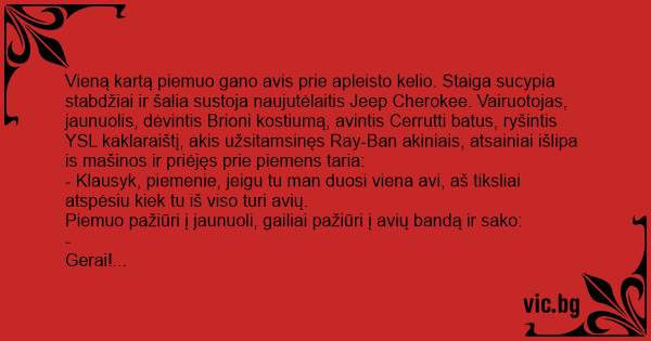 Vieną kartą piemuo gano avis prie apleisto kelio. Staiga sucypia stabdžiai ir šalia sustoja naujutėlaitis Jeep Cherokee. Vairuotojas, jaunuolis, dėvintis Brioni kostiumą, avintis Cerrutti batus, ryšintis YSL kaklaraištį, akis užsitamsinęs Ray-Ban akiniais, atsainiai išlipa is mašinos ir priėjęs prie piemens taria: