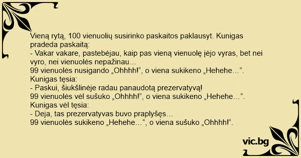 Vieną rytą, 100 vienuolių susirinko paskaitos paklausyt. Kunigas pradeda paskaitą: