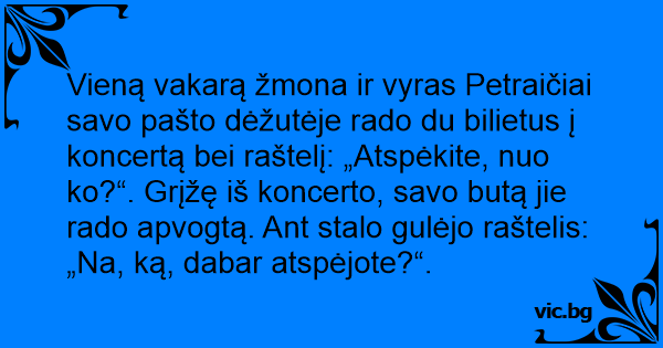 Vieną vakarą žmona ir vyras Petraičiai savo pašto dėžutėje rado du bilietus į koncertą bei raštelį: „Atspėkite, nuo ko?“. Grįžę iš koncerto, savo butą jie rado apvogtą. Ant stalo gulėjo raštelis: „Na, ką, dabar atspėjote?“.