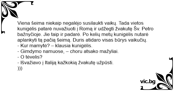 Viena šeima niekaip negalėjo susilaukti vaikų. Tada vietos kunigėlis patarė nuvažiuoti į Romą ir udžegti žvakutę Šv. Petro bažnyčioje. Jie taip ir padarė. Po kelių metų kunigėlis nutarė aplankyti tą pačią šeimą. Duris atidaro visas būrys vaikučių.
