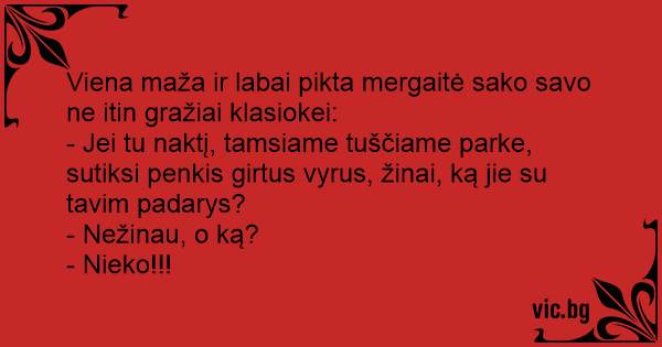 - Jei tu naktį, tamsiame tuščiame parke, sutiksi penkis girtus vyrus, žinai, ką jie su tavim padarys?