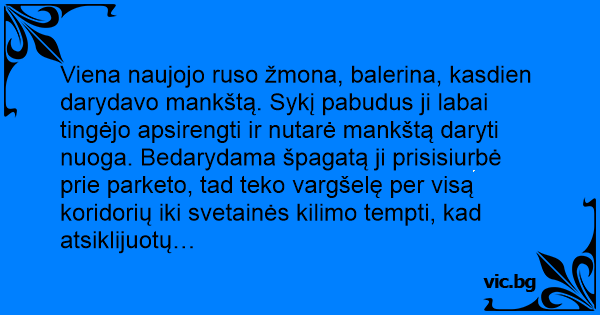 Viena naujojo ruso žmona, balerina, kasdien darydavo mankštą. Sykį pabudus ji labai tingėjo apsirengti ir nutarė mankštą daryti nuoga. Bedarydama špagatą ji prisisiurbė prie parketo, tad teko vargšelę per visą koridorių iki svetainės kilimo tempti, kad atsiklijuotų…