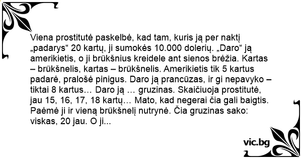 Viena prostitutė paskelbė, kad tam, kuris ją per naktį „padarys“ 20 kartų, ji sumokės 10.000 dolerių. „Daro“ ją amerikietis, o ji brūkšnius kreidele ant sienos brėžia. Kartas – brūkšnelis, kartas – brūkšnelis. Amerikietis tik 5 kartus padarė, pralošė pinigus. Daro ją prancūzas, ir gi nepavyko – tiktai 8 kartus… Daro ją … gruzinas. Skaičiuoja prostitutė, jau 15, 16, 17, 18 kartų… Mato, kad negerai čia gali baigtis. Paėmė ji ir vieną brūkšnelį nutrynė. Čia gruzinas sako: viskas, 20 jau. O ji sako, ne, 19 tiktai!!! Žiūrėjo gruzinas į sieną, žiūrėjo, paėmė, nutrynė viską ranka: