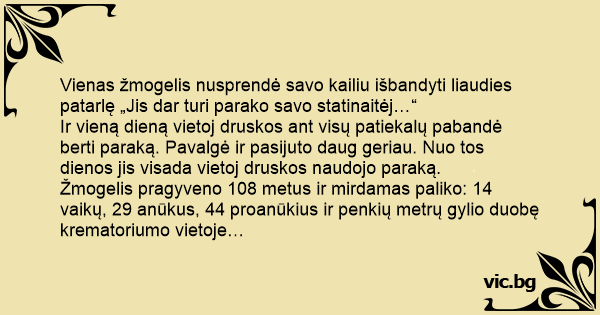 Ir vieną dieną vietoj druskos ant visų patiekalų pabandė berti paraką. Pavalgė ir pasijuto daug geriau. Nuo tos dienos jis visada vietoj druskos naudojo paraką.