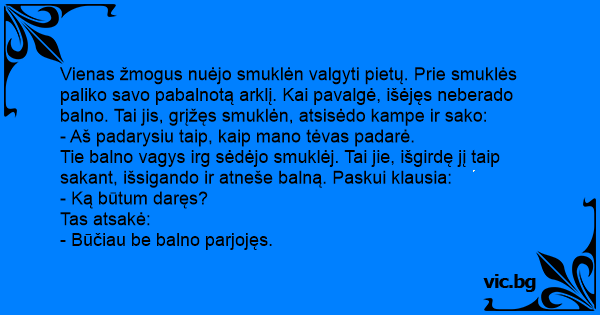 Vienas žmogus nuėjo smuklėn valgyti pietų. Prie smuklės paliko savo pabalnotą arklį. Kai pavalgė, išėjęs neberado balno. Tai jis, grįžęs smuklėn, atsisėdo kampe ir sako: