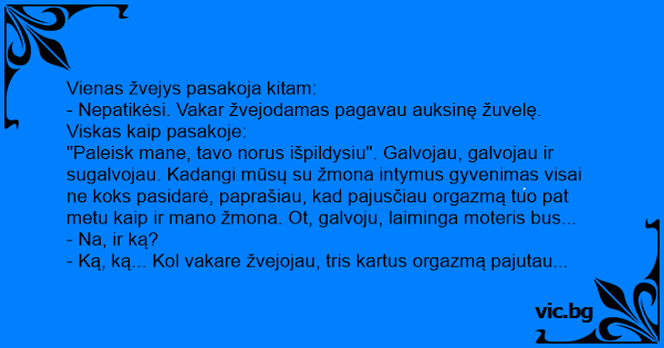 "Paleisk mane, tavo norus išpildysiu". Galvojau, galvojau ir sugalvojau. Kadangi mūsų su žmona intymus gyvenimas visai ne koks pasidarė, paprašiau, kad pajusčiau orgazmą tuo pat metu kaip ir mano žmona. Ot, galvoju, laiminga moteris bus...