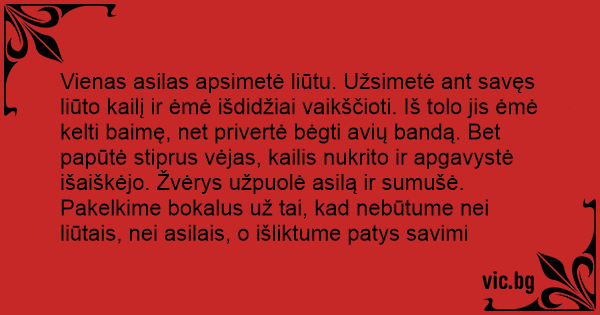 Vienas asilas apsimetė liūtu. Užsimetė ant savęs liūto kailį ir ėmė išdidžiai vaikščioti. Iš tolo jis ėmė kelti baimę, net privertė bėgti avių bandą. Bet papūtė stiprus vėjas, kailis nukrito ir apgavystė išaiškėjo. Žvėrys užpuolė asilą ir sumušė. Pakelkime bokalus už tai, kad nebūtume nei liūtais, nei asilais, o išliktume patys savimi