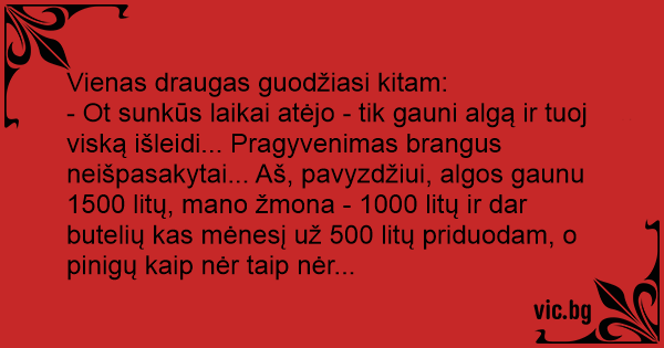 - Ot sunkūs laikai atėjo - tik gauni algą ir tuoj viską išleidi... Pragyvenimas brangus neišpasakytai... Aš, pavyzdžiui, algos gaunu 1500 litų, mano žmona - 1000 litų ir dar butelių kas mėnesį už 500 litų priduodam, o pinigų kaip nėr taip nėr...