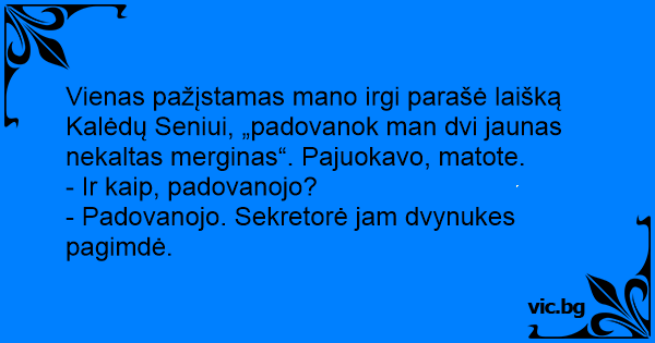 Vienas pažįstamas mano irgi parašė laišką Kalėdų Seniui, „padovanok man dvi jaunas nekaltas merginas“. Pajuokavo, matote.