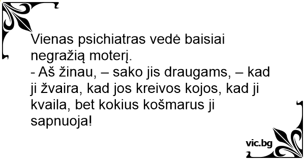 - Aš žinau, – sako jis draugams, – kad ji žvaira, kad jos kreivos kojos, kad ji kvaila, bet kokius košmarus ji sapnuoja!