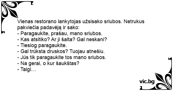 Vienas restorano lankytojas užsisako sriubos. Netrukus pakviečia padavėją ir sako: