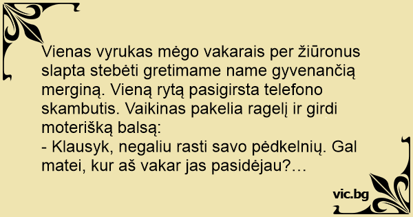 - Klausyk, negaliu rasti savo pėdkelnių. Gal matei, kur aš vakar jas pasidėjau?…