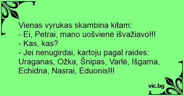 - Jei nenugirdai, kartoju pagal raides: Uraganas, Ožka, Šnipas, Varlė, Išgama, Echidna, Nasrai, Ėduonis!!!